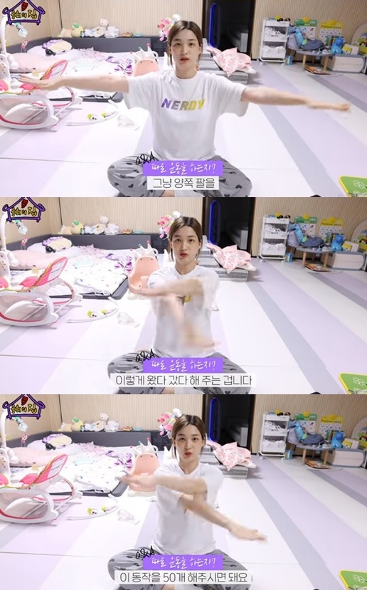 율희는 팔을 앞으로 쭉 편 뒤 양쪽으로 휘저으며 "이걸 50회를 하면 된다. 팔뚝이 불타오르는 느낌이다"라고 설명했다.