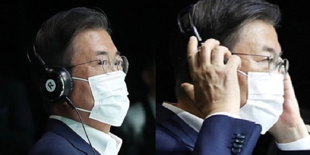 이날 행사에서 문재인 대통령은 행사장 자리에 앉아 헤드폰을 착용하고서는