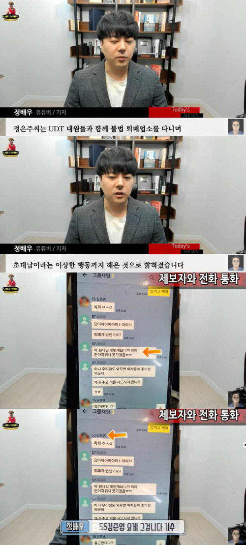 정은주와 로건이 불법 퇴폐업소 출입을 추정할 수 있는 내용들이 담겨있어 충격을 안겼다.