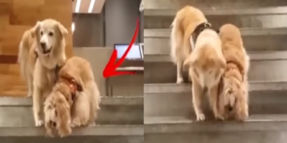 앞이 보이지 않는 친구를 참을성 있게 안내하는 안내견의