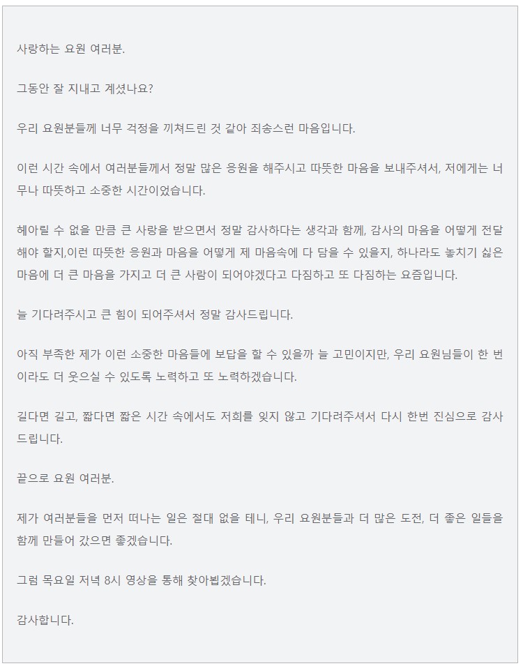 "목요일 저녁 8시 영상을 통해 찾아뵙겠습니다"라고 말하면서 재시작을 예고했다.