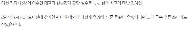 | "이들을 따로 뽑고 있다는거 아시나요?"..연예인이 꿈이었는데 '접대용 연습생'으로 뽑혔다는 충격적인 사건 (0) | 2020.11.05 |