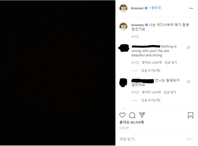 검정색 배경 사진을 올리면서 "나는 어디서부터 뭐가 잘못된건가요?" 라는