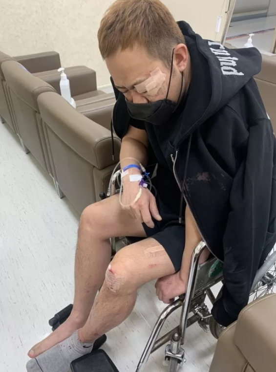 휠체어를 타고있던 그는 다리 전체에 붕대를 감고서 침대에 누워 휴식을 취하고 있는듯하다.