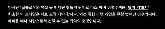 | 현재 딥플로우가 교묘하게 편집 당해 억울하다고 말하는 디스 뮤비 중 '넉살' 부분 정확하게 되짚어보니 생긴 일ㄷㄷㄷ (0) | 2020.12.23 |