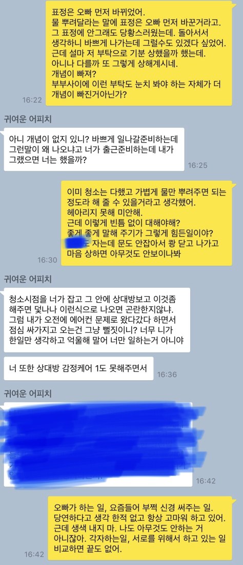 아기랑 내게 인사도 안하고 나가기에 전화해서 따지니 나보고 저부탁이 개념이 빠진거라고 함.