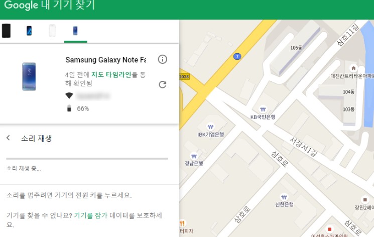여부와 배터리 잔량도 함께 확인할 수 있다. 지도를 통해 확인한 휴대폰의 위치 근처에 있다면