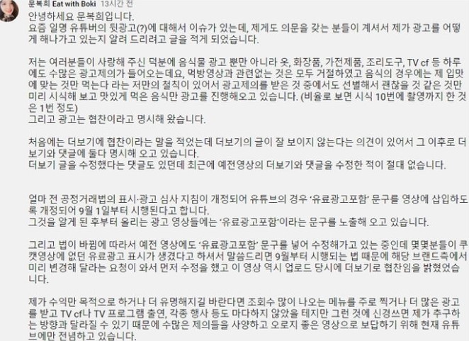 그리고 문복희는 지금까지의 광고는 협찬이라고 명시해왔음을 강조했다. 더보기에 협찬이라고 밝혔는데,