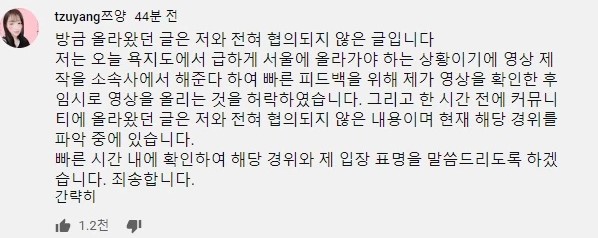 커뮤니티 글이 삭제된 후 쯔양은 "방금 올라왔던 글은 저와 전혀 협의되지 않은 글"이라며 "현재 해당