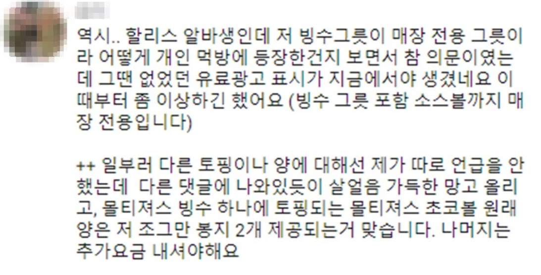 할리스 알바생 주장에 따르면 몰티져스 빙수는 영상에 나온 듯이 변함없지만 망고 빙수는 생망고가 토핑돼있는 영상과