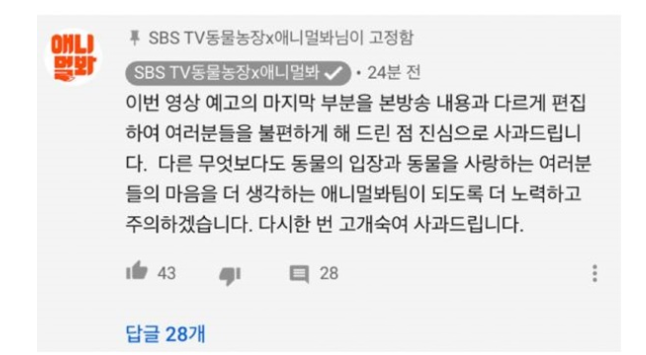 이에 ‘애니멀봐’ 측은 해당 예고편을 삭제하고 새로 영상을 올리면서 댓글을 통해 사과문을 남겼다.