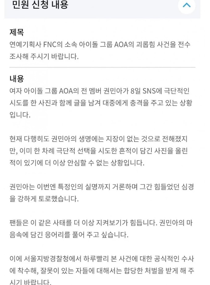 팬들은 민원 내용에 "아이돌 그룹 'AOA' 전 멤버 민아가 SNS에 극단적 선택을 시도한 사진을 올려