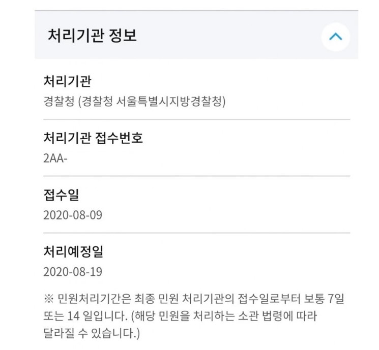 한편, 서울지방경찰청 민원 처리 기간은 접수일로부터 보통 7일에서 14일이 걸린다.