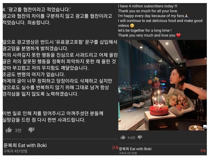 그는 “2020년 3월 이전 영상에 유료 광고 표기를 하지 않았으며 영상 내에서도 광고라고 밝히지 않았다.