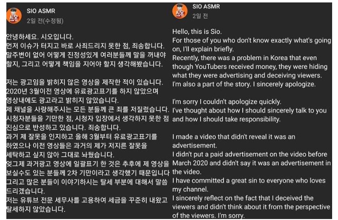 유튜버들의 뒷광고가 논란인 가운데 사과문의 정석이라며 네티즌들에 호평을 받은 유튜버가 있다.