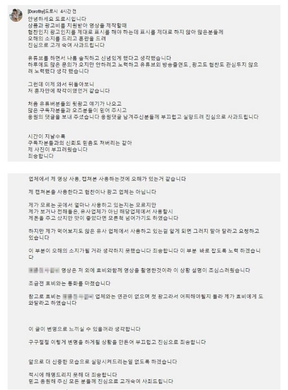 영상을 제작할 때 협찬인지 광고인지 제대로 표기를 하지않아 오해의 소지와 혼란을 드렸다"