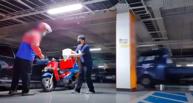 송대익은 밖에서 기다리면서 배달 기사와 마주치면 준비한 봉지를 건넸다.