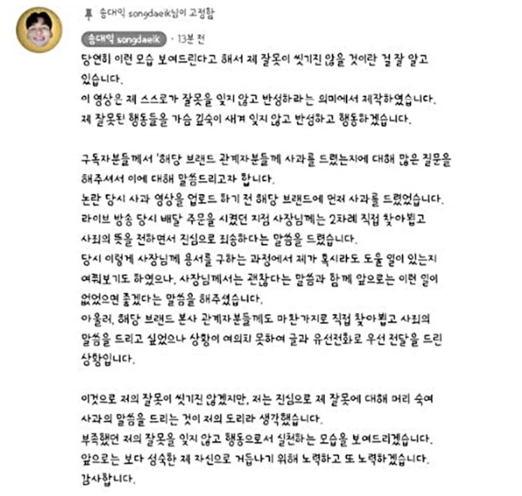 지난 12일 송대익은 '피해를 끼쳐 죄송합니다'라는 4분 23초짜리 영상을 올렸다.