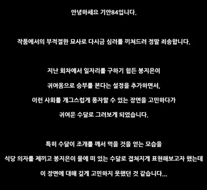 기안84는 "작품에서의 부적절한 묘사로 다시금 심려를 끼쳐드려 정말 죄송합니다"라며
