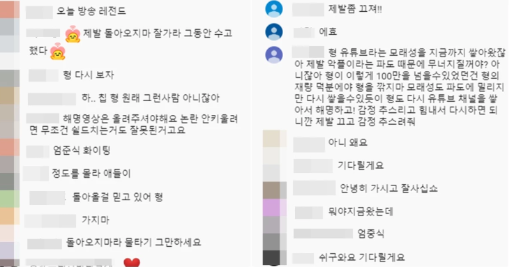 언제까지라도 기다리겠다는 응원이 대부분인 한편, 다시는 돌아오지 말라는 비난도 상당한편이다.