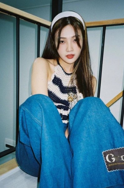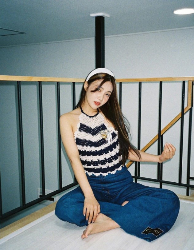 조이는 이너 없이 홀터넥 톱만 입은 채 헤어밴드를 매치해 아이유와는 다른