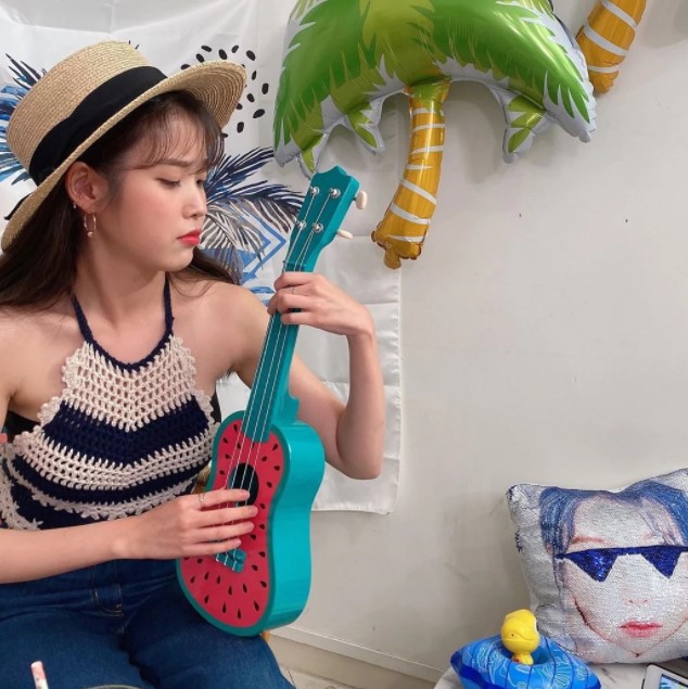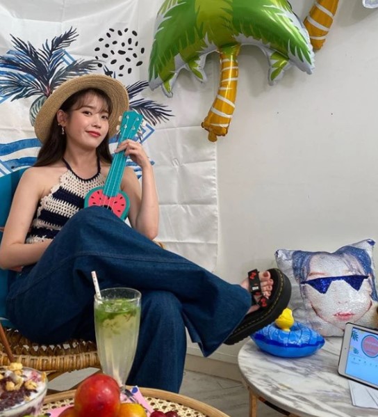 지난 13일 아이유는 자신의 인스타그램에 "집콕 바캉스"라는 글과 함께 자신의 사진을 올렸다.