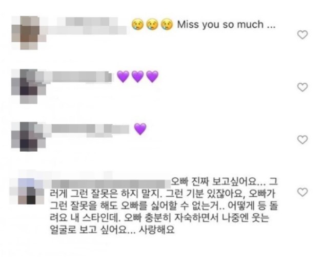 오빠 충분히 자숙하면서 나중엔 웃는 얼굴로 보고 싶어요... 사랑해요" 등의 댓글이 최근까지 달리고 있다.