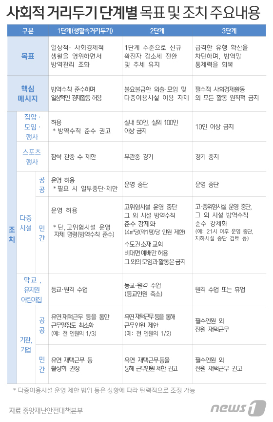 거리두기 조치의 핵심은 사람간 접촉을 얼마나 줄이느냐에 있다. 단계가 올라갈수록 그 강도가 세진다.
