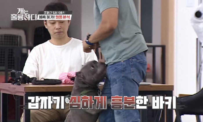 행동 분석 중 토비는 다시 강형욱에게 마운팅을 시도를 했다 , 이를 본 강형욱은