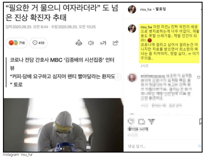 지난 25일 오후 하리수는 자신의 인스타그램에 "이런 미친X. 진짜 국민의 세금으로 병 치료하는게