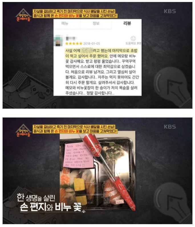 당시 리뷰 작성자는 "사실 어제 죽으려고 했는데 마지막으로 초밥이 먹고 싶어서 주문했다.