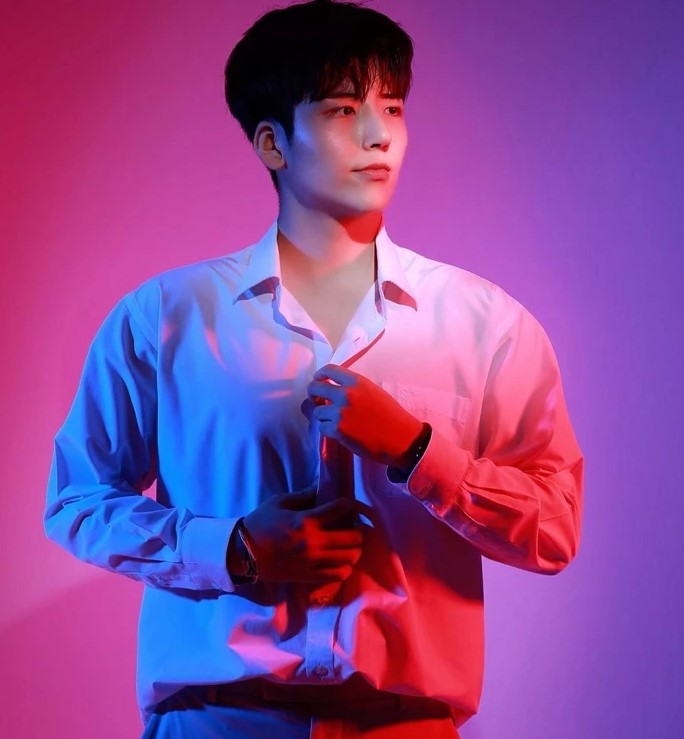 붉은빛과 푸른빛이 섞인 조명은 깊은 바다 같은 그의 매혹적인 눈빛을 더욱 돋보이게 했다.