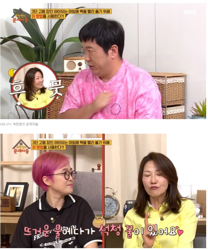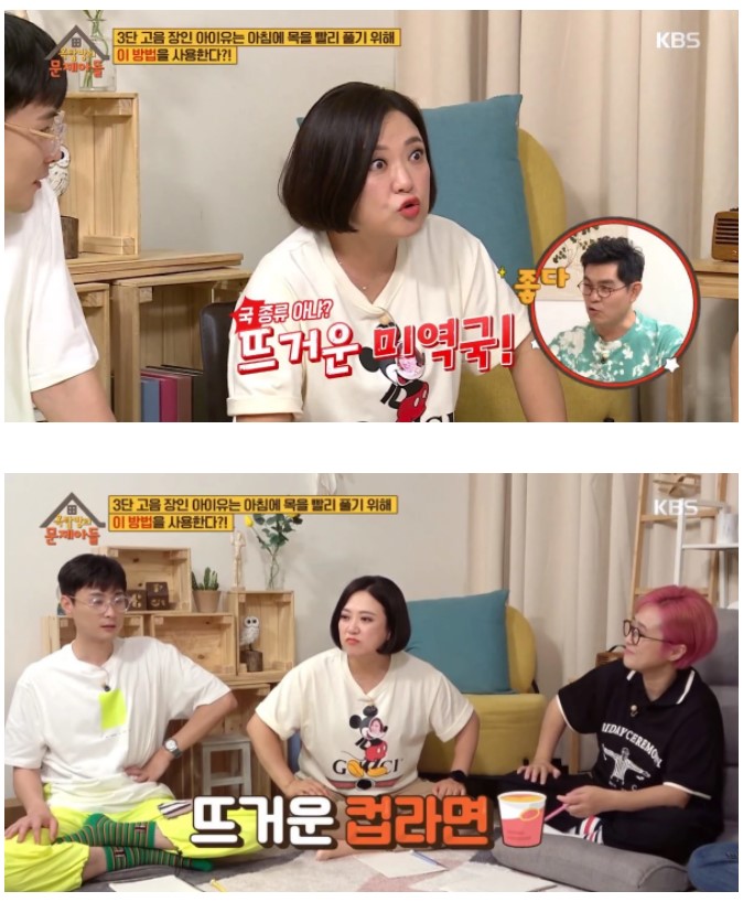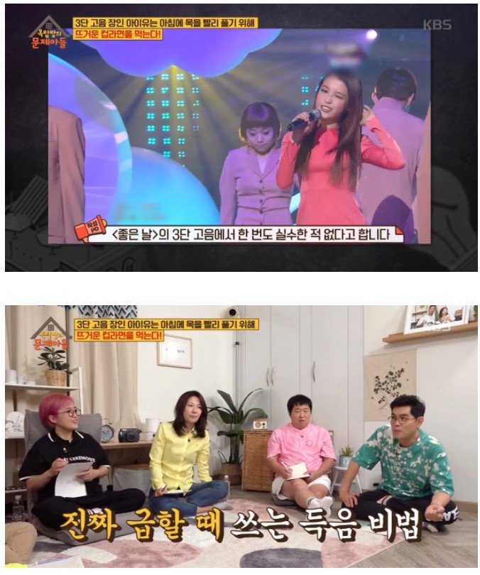 제작진은 "3단 고음 장인 아이유는 아침에 목을 빨리 풀기 위해 '이 방법'을 사용한다"며 문제를 냈다.