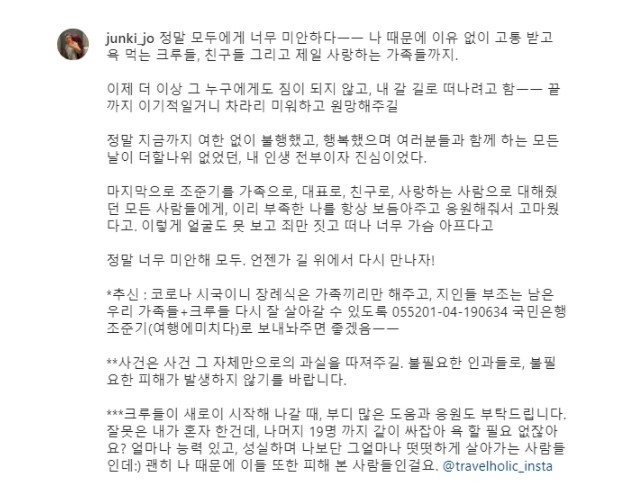 "마지막으로 조준기를 가족으로 대표로, 친구로, 사랑하는 사람으로 대해줬던 모든 사람들에게 부족한