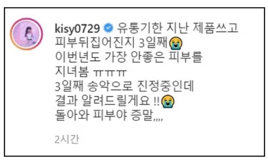 그녀는 "유통기한 지난 제품 쓰고 피부 뒤집힌 지 3일 째. 이번 년도